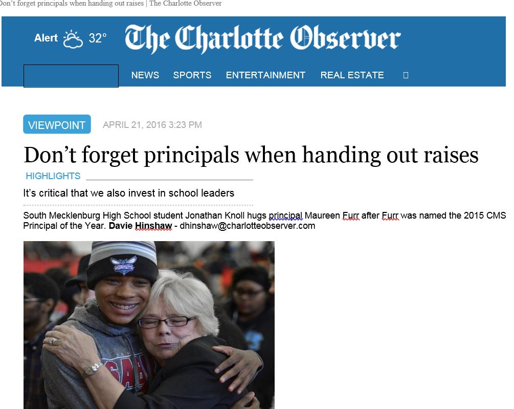 From J. Walter McDowell, board chair of Business for Educational Success and Transformation North Carolina (BEST NC): McDowell Christer Berg It’s time for North Carolina to treat principals with the respect and compensation they deserve. As the legislative session resumes next week, business leaders across North Carolina will be looking for a strong focus on what we know is key to the success of any organization – the best possible talent. For BEST NC members who believe that North Carolina can have the best education system in the nation, this means a strong focus on North Carolina’s  educators. We are seeing signs that the new budget will continue to increase teacher pay, as it has for the last few years. These are crucial investments for recruiting and retaining great teachers and we ask that the governor and General Assembly also think about the systems of support for  theseteachers. Along with investing in North Carolina’s teachers, it is also critical that we invest in our school leaders. In the private sector, our business members know that great leaders matter. Research – not just intuition – tells us the same is true in schools. Teachers can perform at their best when they have strong and supportiveprincipals. Take Alison (Harris) Welcher, principal at Ranson IB Middle School in Charlotte from 2011- 2015. More than 80 percent of Ranson students in 2014 lived in poverty. Once one of the district’s lowest performers, Ranson enabled students last year to achieve the  highest academic growth among Title I schools in the state and was in the state’s top one percent overall for growth. The current Ranson principal, Erica Jordan-Thomas, is following in Ms. Welcher’s path, continuing the tradition of strong leadership. Without a corps of outstanding principals like Ms. Welcher and Ms. Jordan-Thomas, the effectiveness of all of the other K-12 programs the governor and General Assembly propose will be compromised. Fortunately in 2015, North Carolina policymakers made a crucial investment in school leadership by establishing the Transforming Principal Preparation program, which aims to significantly increase the rigor and relevance of principal preparation in our state. In addition to recruiting and preparing great school leaders, it is also critical to compensate them as the important professionals they are. Unfortunately, North Carolina’s principal compensation is not competitive within our region or the nation. We have the second- lowest average principal salaries in the country. Over the past 10 years, accounting for inflation, North Carolina principals have seen their average salaries decline by approximately 12 percent. Our members at BEST NC understand that great talent is critical to the success of everything we want to accomplish. It is the  same for our schools, which is why elevating all educators is our top advocacy priority. We urge the governor and General Assembly to continue prioritizing investments in teacher salaries, so we can recruit and retain great talent in the classroom. It is past time to do the same for principals. Together, there may be no more important investments we can make to positively transform education in our  state.