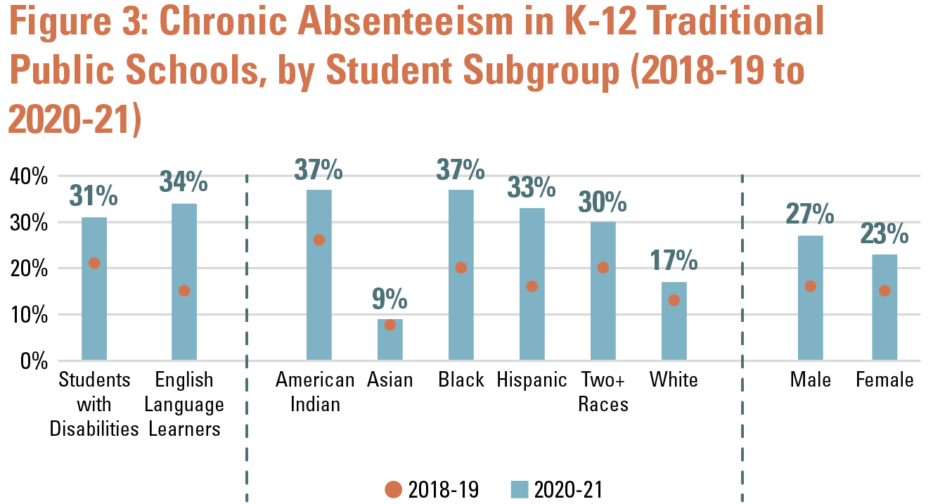 In addition to being substantially higher than pre-pandemic years, documented chronic absenteeism in 2020-21 varied significantly across student subgroups.