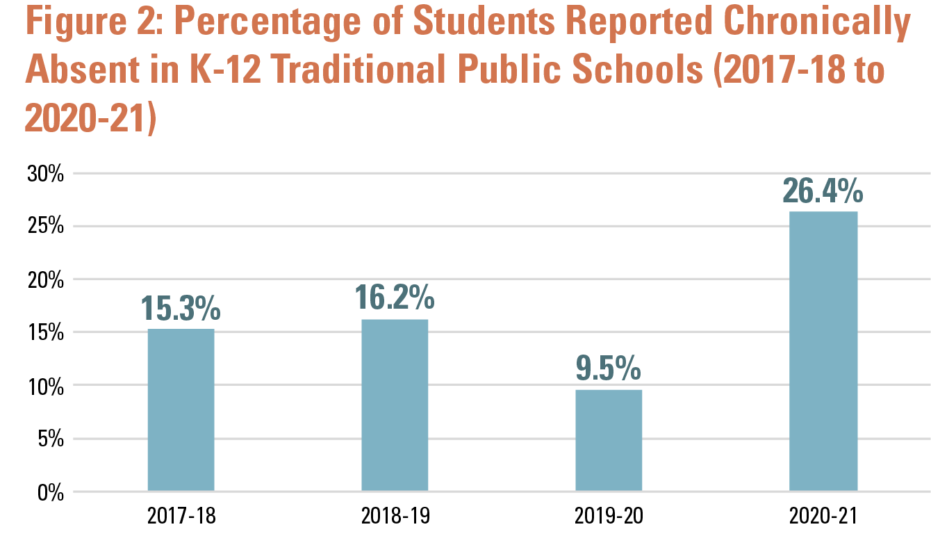 Attendance became more difficult to track during the pandemic because of the variety of instructional delivery methods used, intermittent school closures, and quarantine requirements. As a result, the percentage of students reported as chronically absent in public schools fluctuated relative to pre-pandemic levels (see Figure 2 below).