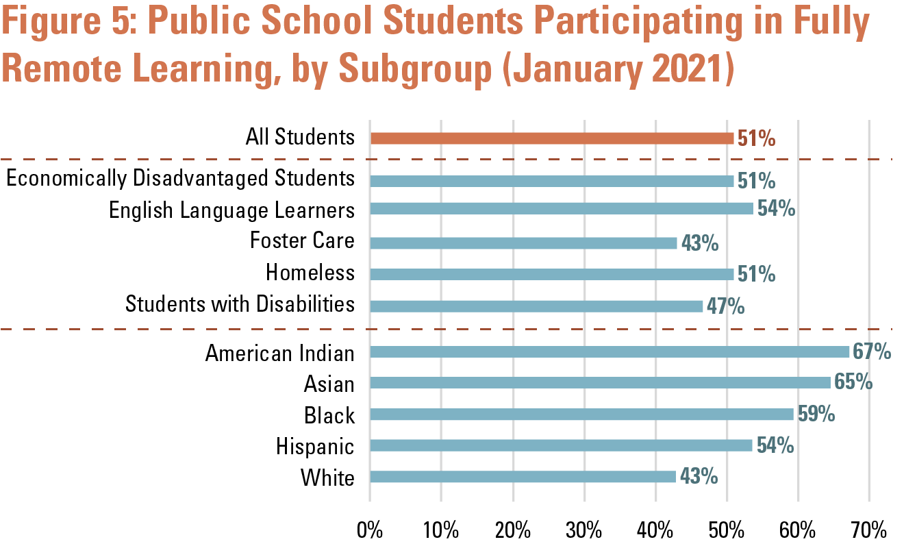 Relatedly, districts provided varying amounts of in-person and remote instruction during the 2020-21 school year. Students of color were more likely to receive remote instruction than White students. However, certain at-risk student populations – such as homeless students, students in foster care, and students with disabilities – were as likely as the average student to receive remote instruction.