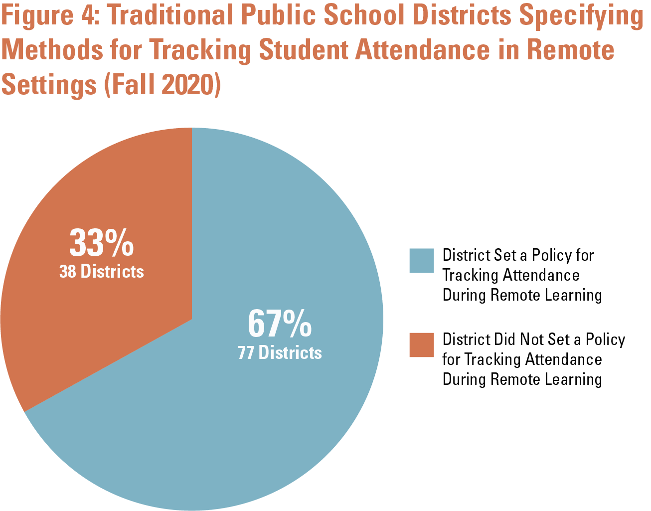 Attendance policies for remote and hybrid learning during the 2020-21 school year were set by local school districts and varied greatly across the state. Variability in (or lack of) district attendance policies for remote instruction had some effect on documented chronic absenteeism amongst traditional public school students.