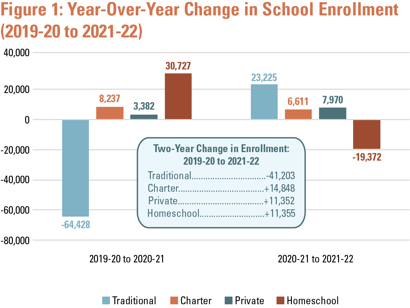 During the 2020-21 school year, in response to the COVID-19 pandemic, school enrollment trends experienced an accelerated shift, with homeschooling seeing a sharp uptick, and significant but less dramatic increases in private and charter school enrollment. The net result was a substantial decline in traditional public school enrollment, which rebounded somewhat in 2021-22 but has not returned to pre-pandemic levels. Meanwhile, the rapid rise in homeschooling seen during the first year of the pandemic has not persisted – approximately 63% of the growth in the homeschool enrollment seen in the 2020-21 school year was lost during the 2021-22 school year.