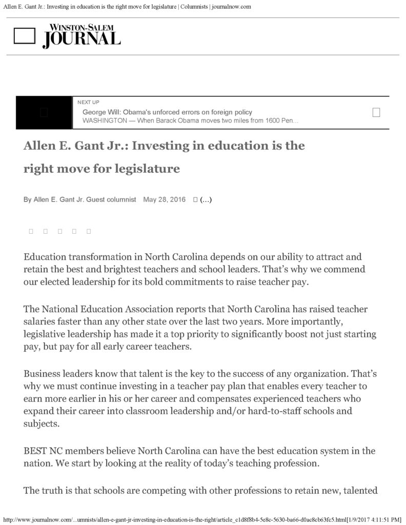 [vc_row][vc_column width=”1/1″][vc_hidrop] BY ALAN E. GANT JR. Gant Photo by – Steve Exum Special to the Observer Education transformation in North Carolina depends on our ability to attract and retain the best and brightest teachers and school leaders. That’s why we commend our elected leadership for their bold commitments to raise teacher pay. The National Education Association reports that North Carolina has raised teacher salaries faster than any other state over the last two years. More importantly, legislative leadership has made it a top priority to significantly boost not just starting pay, but pay for all early career teachers. Business leaders know that talent is the key to the success of any organization. That’s why we must continue investing in a teacher pay plan that enables every teacher to earn more earlier in their career and compensates experienced teachers who expand their career into classroom leadership and/or hard-to-staff schools and subjects. BEST NC members believe North Carolina can have the best education system in the nation. We start by looking at the reality of today’s teaching profession. The truth is that schools are competing with other professions to retain new, talented teachers. Even though starting teacher pay was raised significantly over the past two years, teachers quickly fall behind their college graduate peers with the slow progression of our pay schedule. That is one big reason turnover is so high among younger teachers in North Carolina. The other hard reality is that we don’t compensate teachers as we do other highly skilled professions. In most other professions, earnings potential keeps up with early career growth and includes additional opportunities for specialized skills or achievement. Currently, North Carolina teachers can’t reach top earnings until they are nearly 50 years old. No other high-skilled profession follows such a slow curve. To be clear – teaching is a highly skilled profession, requiring teachers to make complex, real-time decisions to ensure students are engaged and learning. Plus, the demands of the economy require teachers to meet higher expectations and provide personalized learning for all students. We must ensure that our classroom teachers have the respect and compensation commensurate with this demandingjob. Giving higher raises to early-career teachers will help recruit top talent to the profession, reduce turnover, and enable them to earn more, faster. We can continue building on these gains by compensating experienced teachers for taking on leadership roles, teaching in hard-to- fill subject areas or taking positions in hard-to- staffschools. We commend both the governor and House leadership for prioritizing pay increases for teachers and principals in their budget proposals. The Senate pay plan that was previewed Wednesday appears to build on those proposals, offering a multi-year commitment to a visionary plan for paying teachers commensurate with the importance and skill of their profession. Gant is chairman and CEO of Glen Raven, Inc. and a member of BEST NC. Click here to view Allen E. Gant Jr. -Investing in education PDF [/vc_hidrop][/vc_column][/vc_row]
