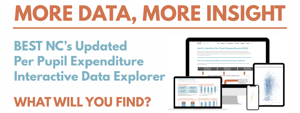 BEST NC Launches Updated Per Pupil Expenditure Data Explorer Tool (2018-19 to 2020-21) BEST NC is pleased to announce the update of its Per Pupil Expenditure (PPE) Data Explorer and landing page, designed to facilitate the understanding and exploration of North Carolina’s school-level spending data and its relationship to other key education indicators. The updated tool features school-level and district-level expenditure data from the 2018-19, 2019-20, and 2020-21 school years. Charter school expenditure data has also been added. Additionally, the tool now offers the ability to examine longitudinal changes in spending at the school level and the ability to view COVID relief fund expenditures at the district level. About the Tool The federal Every Student Succeeds Act of 2015 requires each state education agency to release school-level per pupil expenditure data. The 2018-19 expenditure data were released in 2020, marking the first time spending data were made available at the school level in North Carolina and uncovering trends that have been masked by district-level data. BEST NC’s web-based Per Pupil Expenditure Data Explorer allows education stakeholders to explore per pupil funding trends across individual schools, within districts, and across districts in North Carolina. Educators, school leaders, parents, policymakers, advocates, and other members of the public can utilize this tool to examine education spending and student outcomes for similar schools based on size, grade level, geography, percent students with disabilities, poverty, and more. By comparing schools with similar characteristics, school leaders and other education stakeholders can identify schools with strong student performance at varying levels of funding and/or relative to the characteristics of their student body. Promising or innovative practices from these schools might then be examined to help improve teaching and learning in similar schools. Note: Student performance metrics are unavailable for the 2019-20 school year, as all end-of-year tests were canceled due to the COVID-19 pandemic. Additionally, in 2020-21, students took end-of-year tests, but North Carolina was granted a waiver from federal accountability requirements, meaning that student proficiency numbers are available, but other school-level metrics – such as School Performance Scores, School Achievement Scores, and School Growth Scores – are not. These data will be available for the 2021-22 school year. The Per Pupil Expenditure Interactive Data Explorer can be accessed on BEST NC’s PPE landing page, alongside summary analyses (see below) and additional resources. Insights and Trends from the Per Pupil Expenditure Data Explorer: Key Findings About North Carolina’s Public Schools With the release of school-level expenditure data, and with the help of BEST NC’s Per Pupil Expenditure Data Explorer, North Carolinians can now explore trends in school spending at the school level, instead of being limited to district-level metrics. Several school-level insights are highlighted on the PPE landing page. Examples of these findings include: Generally, total per pupil expenditures in North Carolina are higher in schools with greater numbers of economically disadvantaged students. In 2020-21, about $3,100 – 32% – more was spent per pupil in the highest poverty schools (schools where 76-100% of students are economically disadvantaged), compared to the lowest-poverty schools (schools where 0-25% of students are economically disadvantaged). In a school with 500 students, this equates to around $1.6 million in additional resources. In this way, North Carolina defies national trends in which lower income schools generally receive less funding than more affluent schools. In general, expenditures of local funds, even within an individual district, appear to be uncorrelated with poverty, so funding equity in most districts is a function of state and federal funding allocations. Total per pupil expenditures (including state, federal, and local funds) increased by $726 per pupil, or 7.5%, over the three-year period from 2018-19 to 2020-21.* $524 of this increase was due to an influx of federal COVID relief dollars. *The 2018 North Carolina state budget was passed in June 2018. Partially due to the COVID-19 pandemic, there was not another comprehensive state budget bill passed into law until November 2021, though some smaller appropriation bills were passed that funded education items. Since March 2020, North Carolina’s K-12 public schools have received over $6 billion in COVID relief funds from the federal government. Schools and districts spent $90 million in COVID relief funds during the 2019-20 school year, $660 million during the 2020-21 school year, and over $2 billion during the 2021-22 school year. Schools have until September 30, 2024 to spend the remaining COVID relief dollars. While COVID relief fund expenditures are not available at the school level (but are embedded in the state and federal fund amounts), district-level data reveal that more COVID relief were spent by districts with higher percentages of students identified as economically disadvantaged. This is likely because COVID relief funding was allocated according to the federal Title I funding formula which is designed to support schools with high concentrations of students in poverty. An in-depth analysis from the 2022 Facts & Figures guide found that districts in the highest poverty quartile received 79% more COVID relief funding, per pupil, than districts in the lowest poverty quartile, and the 10 highest-poverty districts received 163% more COVID relief funding, per pupil, than the 10 lowest-poverty districts. In 2020-21, average per pupil expenditures were $10,623 in traditional public schools and $8,765 in public charter schools. Charter schools, meanwhile, tended to serve students with lower levels of poverty: 54% of charter schools had less than one quarter of their stud