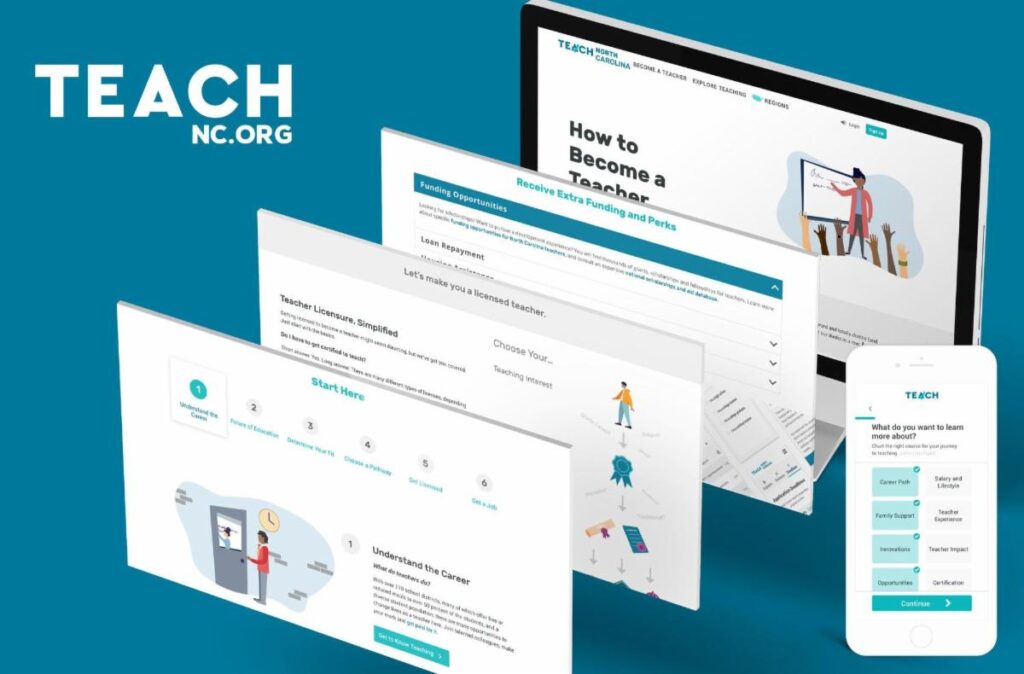 Announcing TeachNC: The One-Stop Resource for Becoming a Teacher in North Carolina We are thrilled to share that, for the first time ever, North Carolina has a unified, statewide teacher recruitment initiative that elevates the teaching profession and seeks to fill critical vacancies! At the August 14th meeting of the North Carolina Education Cabinet, education leaders and stakeholders gathered to celebrate the launch of TeachNC. Aligning with BEST NC’s longstanding commitment to improving the educator pipeline, we have collaborated with the North Carolina Department of Public Instruction and TEACH.org to create this statewide teacher recruitment initiative. TeachNC employs both a broad media campaign and a robust web platform to support teacher candidates in their quest to become a teacher in North Carolina. Members of the NC Education Cabinet stand in support of TeachNC. Why TeachNC? Every student deserves a quality education — that’s a given. What you might not know is that teacher quality is the #1 in-school factor for guaranteeing students’ long-term success. Since educators play a crucial role in the lives of our students, TeachNC is designed to inspire teaching candidates to pursue the career and remove barriers that stand in their way. The Audience The TeachNC initiative seeks to provide accurate and compelling information about the teaching profession that will be useful to both potential candidates and the general public. TeachNC targets students who are just beginning to think about their career options all the way to mid-career professionals who may be considering a career change. The Campaign TeachNC’s media campaign, “Teachers Have Better Work Stories,” highlights the ways in which teaching profession is challenging, fulfilling, and constantly evolving. These career qualities are particularly appealing to Millennials and Generation Z as they seek fulfilling professions. TeachNC’s first public service announcement can be viewed below. TeachNC will also be curating Better Work Stories from real North Carolina teachers. To view the stories collected so far, click here. If you are a teacher or know of one who should share their Better Work Story, please share it here. The Website TeachNC.org is an interactive digital recruitment platform that centralizes all of the information and resources needed to become a teacher: Licensure Understanding licensure is the first step to becoming a teacher. TeachNC outlines licensure requirements and pathways for all candidates, from beginning college students to mid-career professionals. Programs To help candidates choose an educator preparation program (EPP) that will qualify them for licensure, TeachNC provides a database of North Carolina’s EPPs, criteria to help candidates compare options, and advisors to provide 1-on-1 support. Affordability To help candidates understand affordability, TeachNC provides a finance guide with best practices, local and national scholarship listings, and cost-saving strategies. TeachNC also offsets candidates application costs through a $100 reimbursement scholarship. Applications Understanding licensure is the first step to becoming a teacher. TeachNC outlines licensure requirements and pathways for all candidates, from beginning college students to mid-career professionals. More to Come, and What YOU Can Do: Over the next months and years, TeachNC will continue to expand its resources with district landing pages and updated information as licensure requirements change. In the meantime, here is what you can do to help: If you know someone who is thinking about becoming a teacher, please share www.TeachNC.org and encourage them to register to get (free) resources. If you are a teacher and want to share your Better Work Story, take just a minute to film with your phone and upload it here. If you have any ideas or questions, reach out to the TeachNC Director, Princess Brown at Princess@TeachNC.org. TeachNC Partners TeachNC Funders
